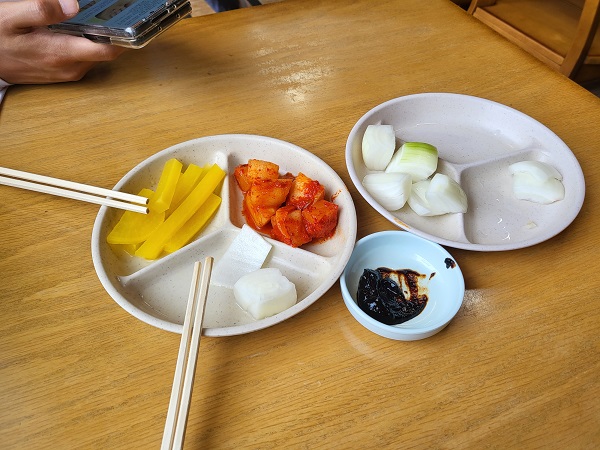 주문하고 기다리면 반찬과 일회용 젓가락을 주십니다. 여느 중국집과 크게 다를바 없는 단무지와 양파 깍두기입니다. 우리가 알고 있는 그 맛이고요. 양파에 춘장 찍어먹는 것을 좋아하는데 춘장을 많이 주셔서 좋았습니다.