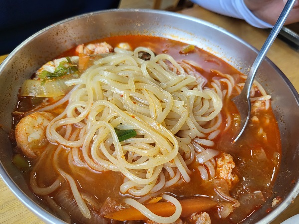 짬뽕에는 야채가 그득했고, 해산물도 많았습니다. 그중에 달마새우라는 큰 새우가 한 마리 떡하니 있고요. 녹진한 국물맛이 아닌 깔끔한 국물입니다. 짬뽕이지만 담백한 국물로 인해 개운하다는 느낌도 났습니다. 남편말로는 짬뽕 느낌보다 탕 느낌이 더 강했다고 했습니다. 기본적인 감칠맛이 있어 호불호 없이 모두 좋아할 맛입니다. 달마새우 맛은 기억 안 나지만 처음 들어보는 새우 이름이라 생소했는데 여하튼 새우는 사랑이고 맛있는 식재료 중 하나니 꼭 드셔보시길 추천드립니다.
