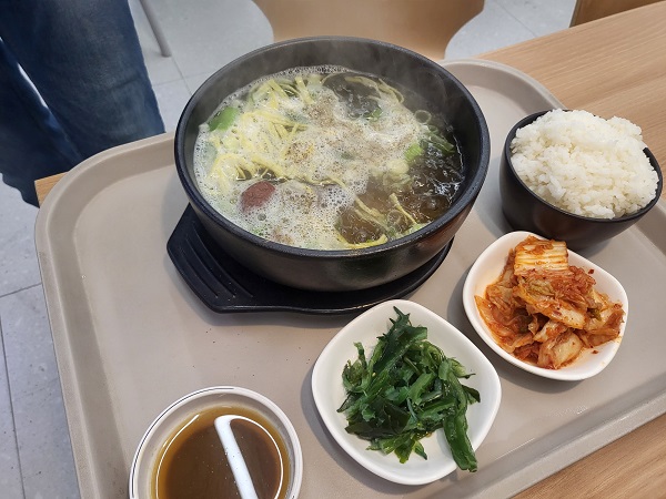 소불고기 비빔밥은 야채도 생각보다 실하게 들어있었습니다. 반숙계란후라이와 소불고기, 콩나물, 당근, 고사리, 시래기? 그리고 비빔밥장까지 맛없지도 아주 맛있지도 않은 딱 비빔밥 맛이었어요. 라면 먹고 먹어서 그런가 오히려 비빔밥 맛이 더 자극적으로 느껴졌을 만큼 간도 괜찮았습니다. 반찬은 김치와 우동국물? 그리고 해초무침 정도 였는데 신맛을 좋아하는 저에게 해초무침은 맛있었습니다. 김치도 누구나 아는 딱 그 밖에서 먹는 김치맛이고요.