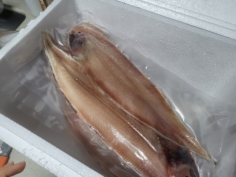 아이스팩을 빼고 보니 조기 5마리와 박대 그리고 반건조 오징어 순으로 들어 있었고 한눈에 봐도 조기 때깔이 좋아 보였습니다. 조기와 반건조 오징어는 진공포장되어있진 않았고 비닐 포장 되어있었다면 박대 경우 2마리씩 진공포장되어 있어 좋았습니다.