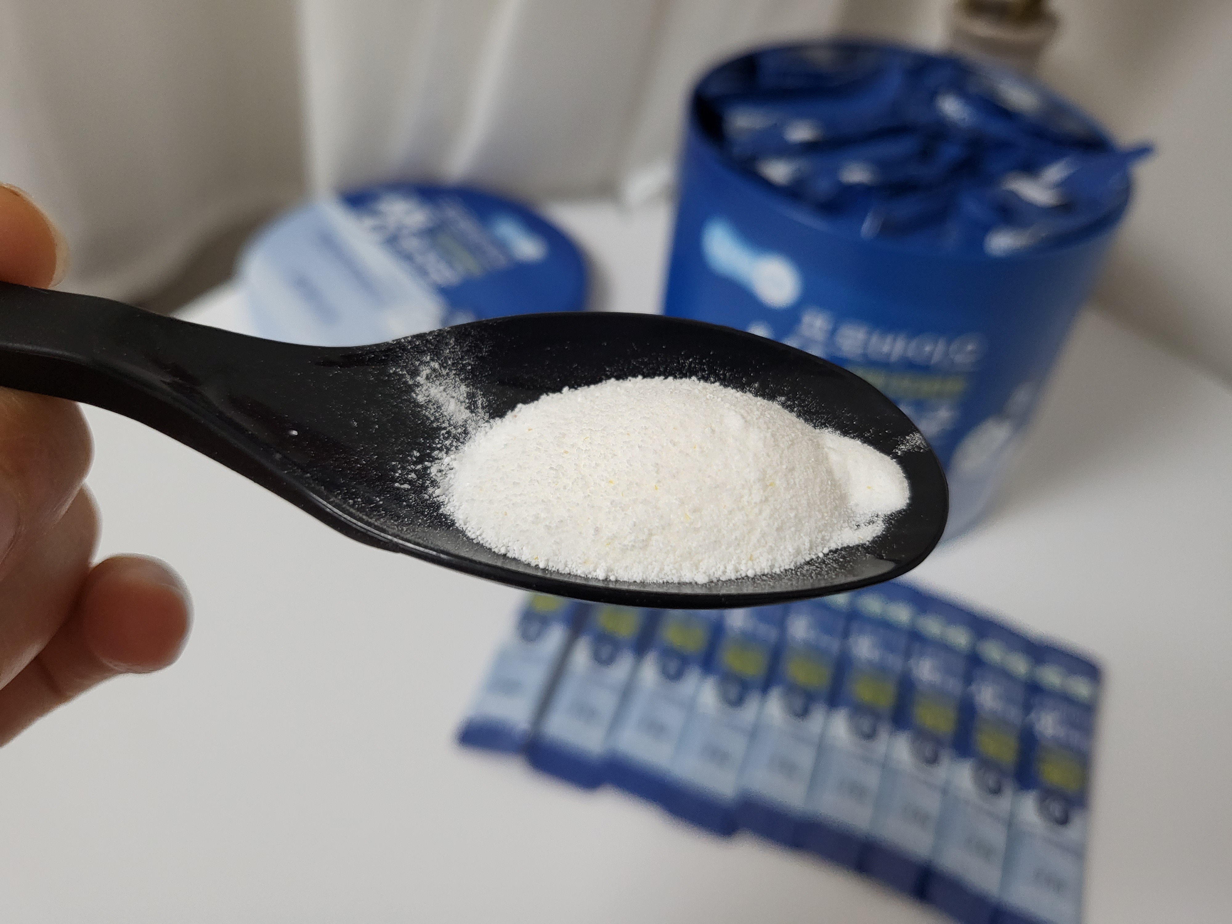 깔끔하게 커팅이 될 수 있게 스마트컷으로 되어있어 편했고요. 유산균 특유의 향도 나고, 색깔은 우윳빛깔이었습니다. 1포 숟가락에 담아보니 2.5g 저 사진 양 정도 되네요. 알약으로 된 유산균 복용이 힘드신 분들은 가루로 된 유산균으로 드시면 되실 것 같습니다. 저는 알약이든 가루든 상관하지 않는 터라, 다만, 뜯을 때 가루가 살짝 날려서 툭툭치고 뜯어야 하는 번거로움이 조금 있긴 합니다.