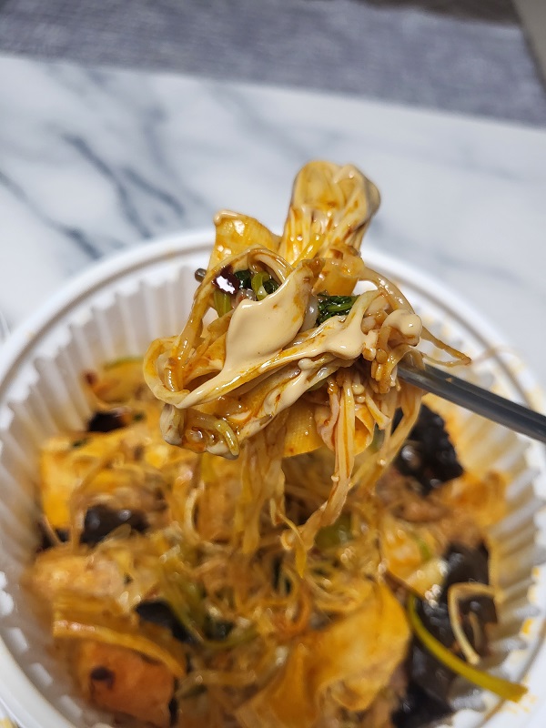 맛있습니다. 기본 하는 맛이었습니다. 기대를 많이 했어서 그런지 또 시켜 먹어야지 하는 맛 까진 아니었습니다. 제 입맛에는 말이죠. 매운맛을 6단계로 선택했지만 제 입에 엄청 맵거나 화하진 않았습니다. 그렇다고 맛이 없는 건 아니고 평범한 맛이었다고 할 것 같아요. 추가한 땅콩소스가 정말 진해서 찍어 먹으면 고소한 맛과 샹궈의 화함과 매콤함이 어우러져 그럼에도 충분히 맛있게 먹었습니다.