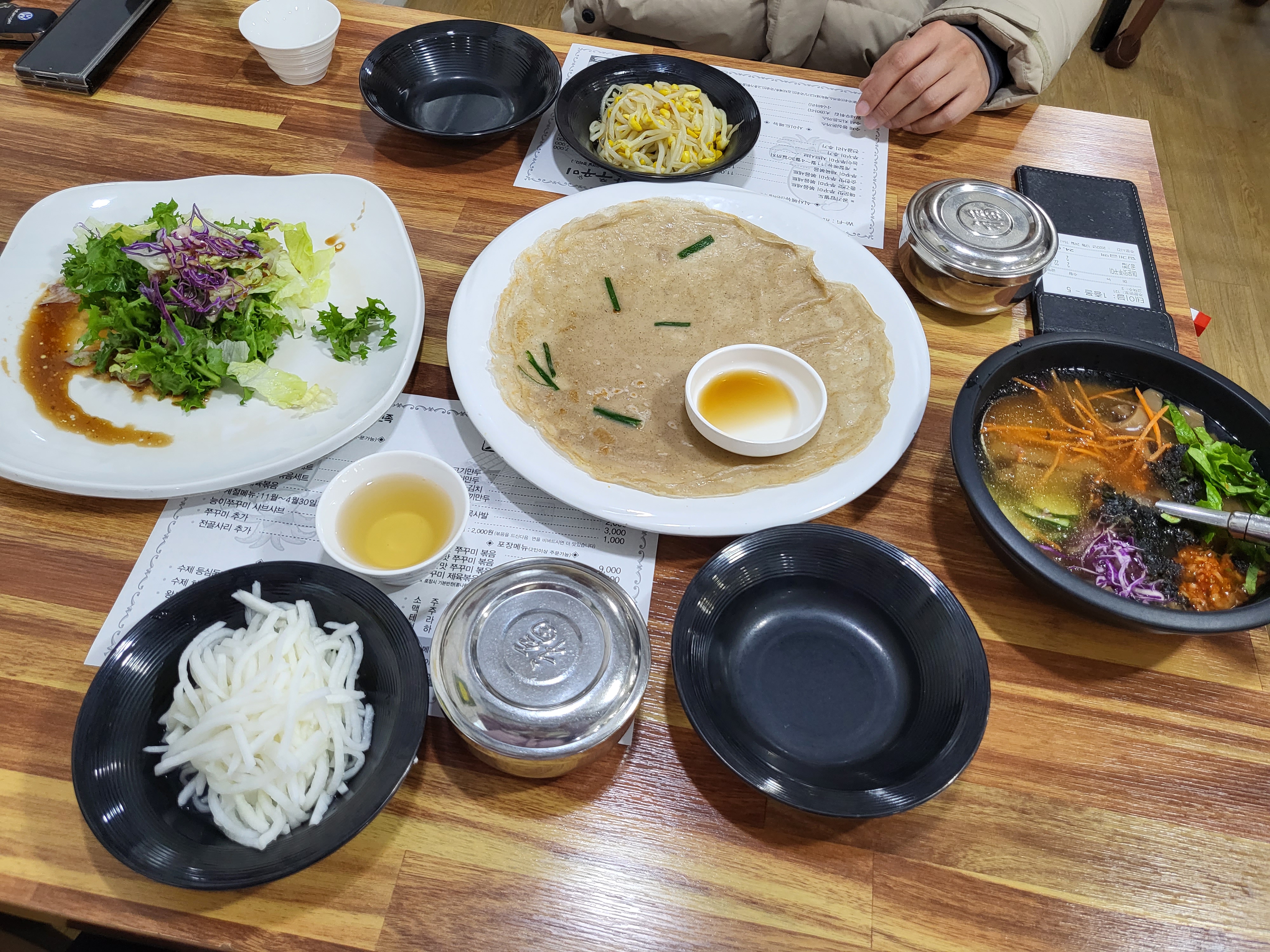 패스트푸드점보다 빠르게 나온 음식이 굉장히 정갈했습니다. 이 속도에 이 정도 퀄리티라니 제대로 왔구나 했습니다. 샐러드와 메밀 전, 그리고 기다렸던 묵사발이 나왔고 무절임과 데쳐진 콩나물도 함께 나왔습니다. 보시다시피 색감이 너무 예뻐서 눈으로 한번 먹고 입으로 한번 먹었습니다.